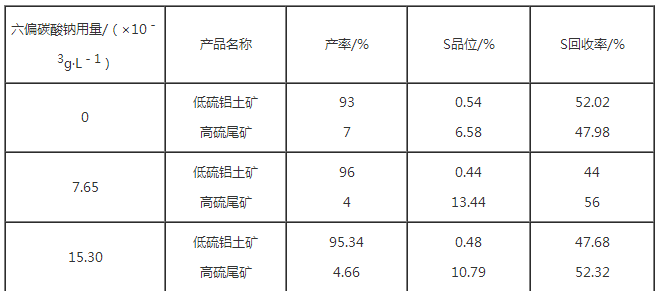 隨著六偏碳酸鈉用量的增加,高硫尾礦中硫的品位先提高而后降低,硫的回收率也是先提高后降低,低硫鋁土礦的產率在小幅度范圍內變化。六偏碳酸鈉用量以7.65×10——3g/L為宜。